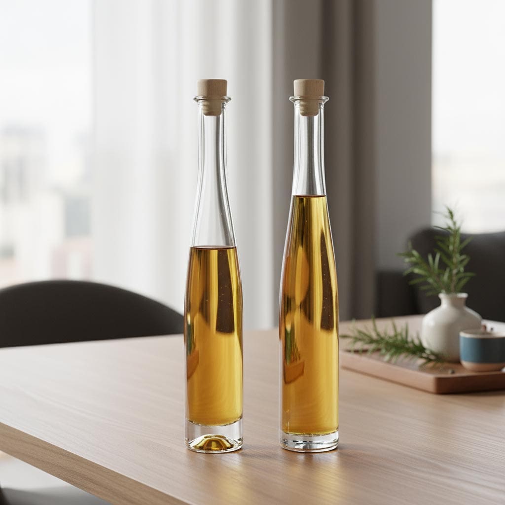 Die Produktserie „Renana“ von Flaschenland umfasst hochwertige Glasflaschen, die speziell für die Aufbewahrung und Präsentation von Spirituosen, Likören und Wein entwickelt wurden. Die 200 ml Glasflasche „Renana Futura“ besticht durch ihre praktische Korkmündung und vereint Funktionalität mit ansprechendem Design. Die Glasflaschen der Renana-Serie sind aus robustem, hitze- und kältebeständigem Glas gefertigt, das sowohl mikrowellen- als auch backofenfest ist. Dadurch sind sie äußerst vielseitig einsetzbar und können problemlos in der Spülmaschine gereinigt werden. Mit einem Fassungsvermögen von 200 ml eignen sich die Flaschen ideal für kleinere Mengen von hochwertigen Spirituosen, Likören oder Wein. Die runde Form der Glasbehälter sorgt für eine harmonische Gestaltung.