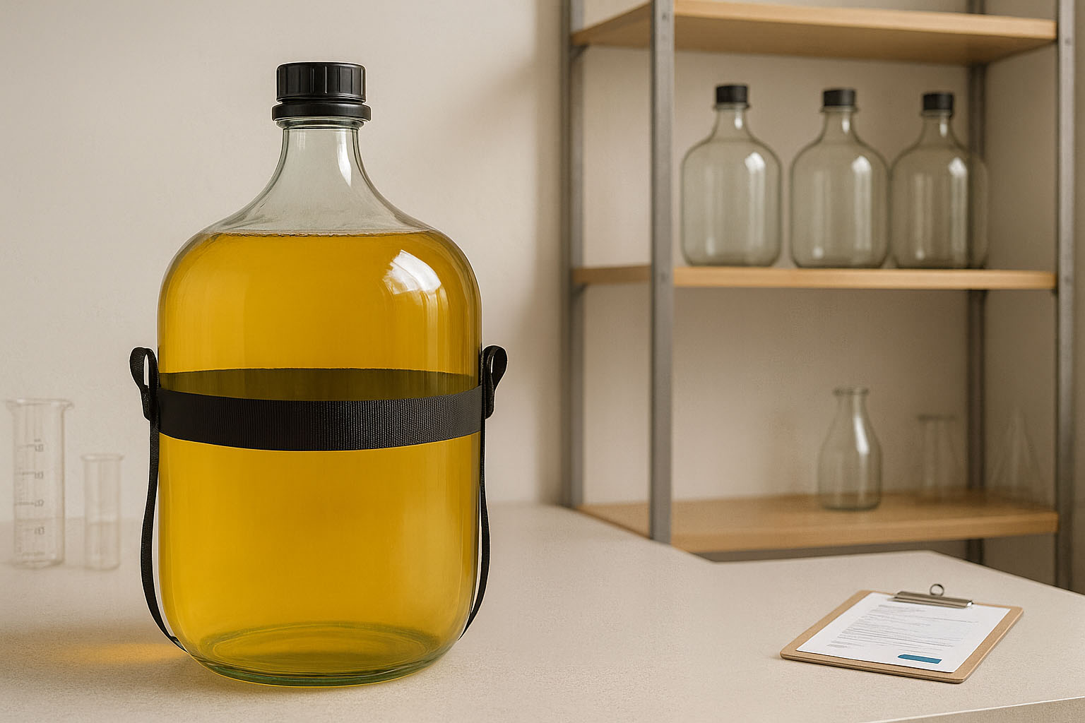 Die Ballonflasche „High End“ kombiniert erstklassige Verarbeitung mit maximaler Sicherheit und Funktionalität. Mit ihrem großzügigen Volumen von 25 Litern bietet sie eine ideale Lösung für die Lagerung und den Transport empfindlicher Flüssigkeiten. Ihre runde Form sorgt für eine gleichmäßige Verteilung des Inhalts, während die Fallschutzpackung mit UN-Zulassung höchsten Sicherheitsstandards entspricht. Der schwarze Originalitätsverschluss gewährleistet eine zuverlässige Versiegelung und schützt vor unbefugtem Zugriff. Zusätzlich sorgen 48 mm breite Textilgurte mit Kunststofftragegriffen für eine komfortable Handhabung, selbst bei vollem Gewicht. Perfekt für die sichere Aufbewahrung und den Transport von Spirituosen, Chemikalien oder anderen sensiblen Flüssigkeiten – die Ballonflasche „High End“ setzt neue Maßstäbe in Qualität und Sicherheit.